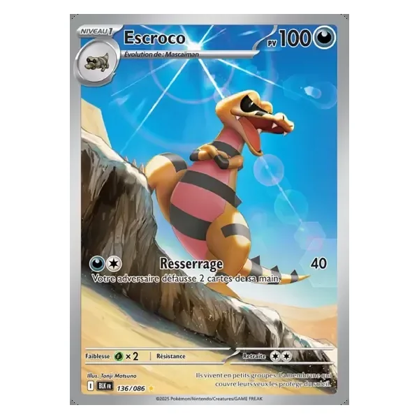 Découvrez Escroco (blk136), une carte Pokémon de l’extension Foudre Noire, provenant du bloc Écarlate & Violet. Idéale pour compléter votre collection, cette carte Illustration Rare plaira autant aux collectionneurs qu’aux joueurs.