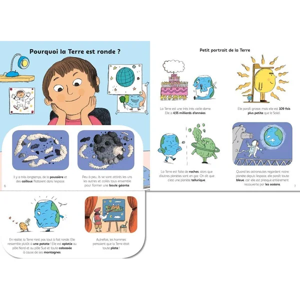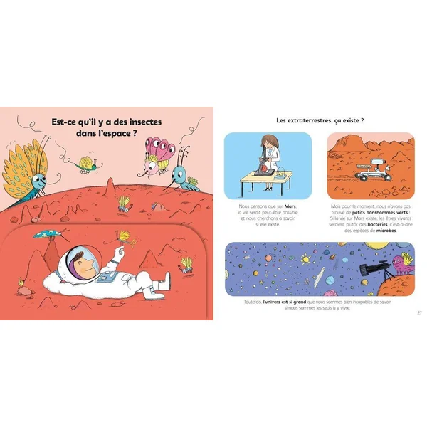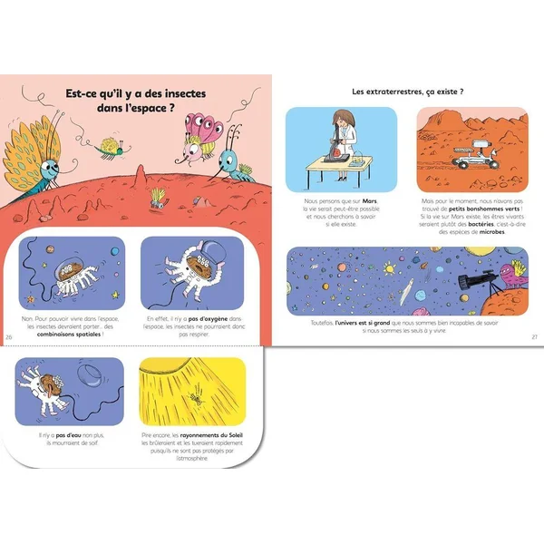 A l’âge des « pourquois », 11 vraies questions d’enfants, très simples, formulées « à la manière des petits », sur de belles illustrations qui mettent en scène la question. Sous les rabats, les réponses illustrées. En page de droite, de nouvelles informations complètent la question, pour en savoir encore plus sur la thématique. Une grande image légendée, en fin d’ouvrage, rassemble tout ce que les enfants ont appris sur l’Espace.