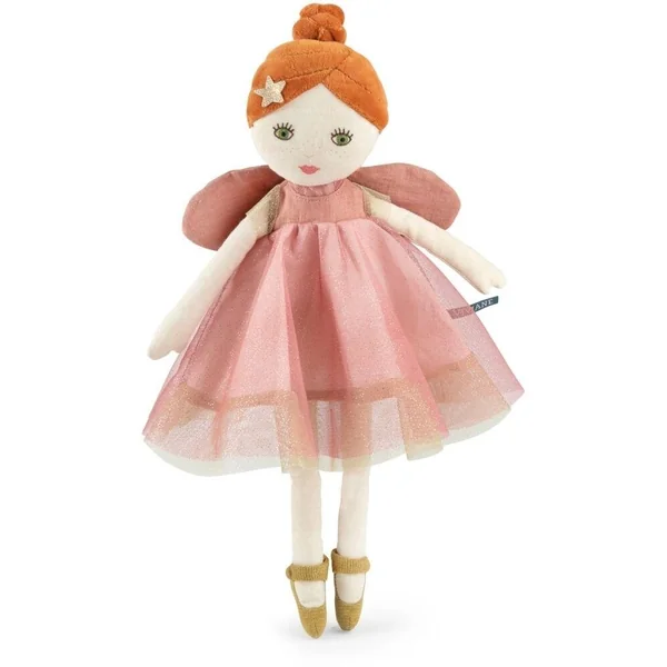 Au visage délicat brodé et sérigraphié, coiffée d’un chignon de velours parée d’une jolie étoile, Vivianne la fée qui illumine les rêves, est vêtue d’une robe rose avec tulle pailleté couleur or et ailes de fée dans le dos et de petits chaussons brillants.
