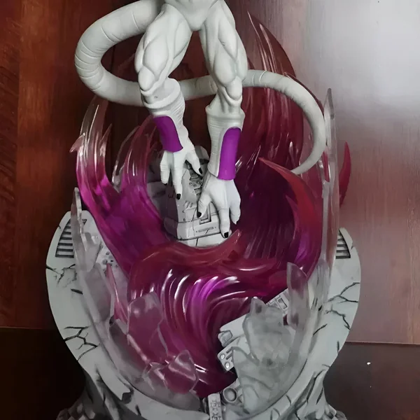 Cette figurine capture Freezer dans une position de force et d’autorité. Il est campé au-dessus d’une base tourmentée, comme s’il venait de surgir d’un chaos qu’il aurait lui-même engendré. Son corps, aux traits acérés, est mis en valeur par des finitions soignées qui rappellent son apparence dans la série animée. La courbure de sa queue, la position de ses mains et l’inclinaison de sa tête sont autant de détails qui témoignent de la maîtrise de l’artiste dans la retranscription de son caractère impitoyable et impérieux. Ses pieds semblent flotter au-dessus du sol, soulignant sa légèreté et son agilité malgré sa puissance brute, créant une scène saisissante de puissance maîtrisée.