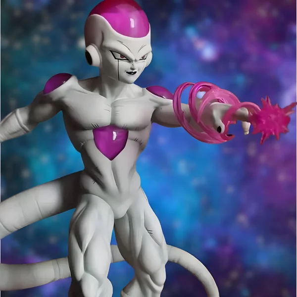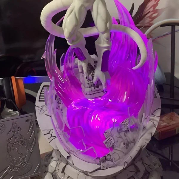 L’attention portée aux détails se manifeste également dans les effets d’énergie qui entourent Freezer. La sphère de couleur magenta qu’il manipule entre ses mains témoigne de sa puissance incommensurable. Cet effet lumineux dynamique est méticuleusement travaillé pour simuler l’énergie maléfique caractéristique de ses attaques dans la série. La base, ornée d’effets lumineux vaporeux dans les mêmes tons que la boule d’énergie, complète l’ensemble en rehaussant l’impression de dynamisme et de puissance émanant de la figurine. Ces détails renforcent l’aspect dramatique de la scène et rappellent les moments critiques des combats qui ont rythmé la série.