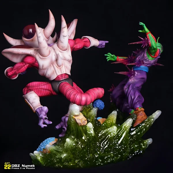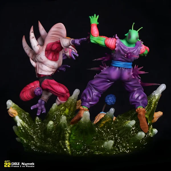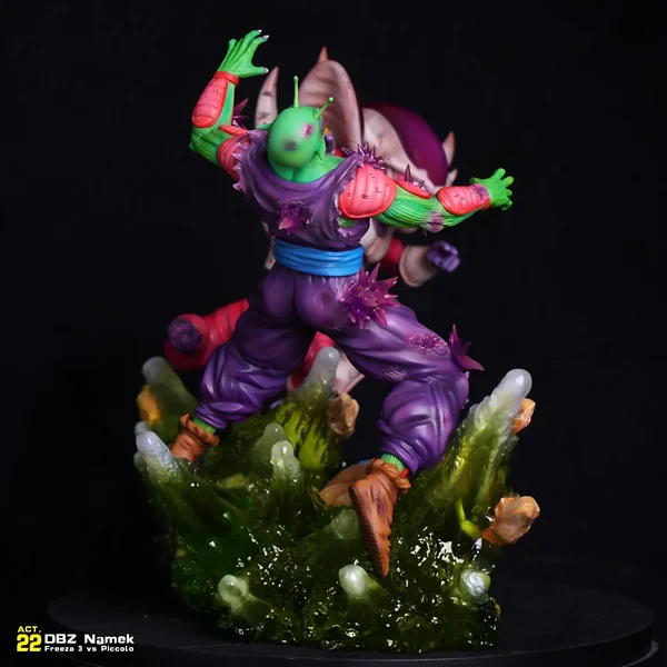 De l’autre côté, on retrouve Piccolo, le guerrier Namek, blessé mais jamais vaincu. On peut apercevoir les stigmates du combat sur son corps, avec des éclats d’énergie violette le transperçant, symbolisant la puissance des attaques de Freezer. Ses muscles sont contractés et sa posture indique qu’il est prêt à contre-attaquer. Son expression est déterminée, un mélange de douleur et de volonté. Son attitude reflète son courage et sa détermination sans faille, des qualités qui font de lui un personnage clé de Dragon Ball Z. Cette représentation fidèle de Piccolo rend hommage à sa résilience et à sa combativité, ajoutant une dimension dramatique à la scène représentée par cette figurine.
