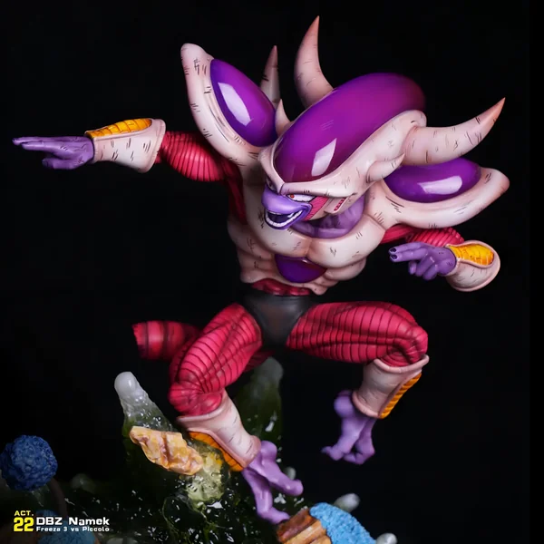 La figurine Freezer VS Piccolo retranscrit la tension palpable du combat sur la planète Namek. Le tyran Freezer, dans sa troisième forme, est représenté dans une posture agressive, pointant son doigt vers Piccolo, prêt à asséner un coup dévastateur. On ressent la froideur et la cruauté émanant de Freezer, un être animé par une soif insatiable de pouvoir. Ses traits acérés, ses cornes imposantes et son regard perçant sont reproduits avec une fidélité impressionnante, capturant l’essence même de ce personnage emblématique de Dragon Ball. Sa musculature imposante et sa couleur typique rose et violette en font une pièce de collection incontournable pour tout fan. Cette figurine incarne la puissance brute et la menace constante que représente Freezer.
