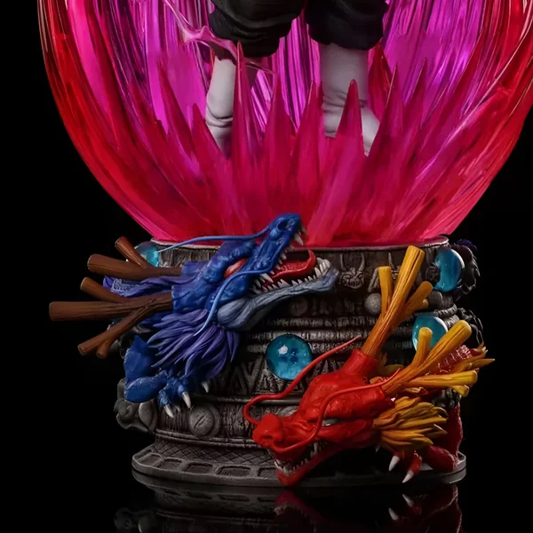 La base, avec ses dragons aux couleurs vives et leurs détails complexes, met en valeur la figurine de Goku Rosé et l’intègre parfaitement dans l’univers Dragon Ball. Les yeux des dragons sont perçants, semblant suivre chaque mouvement, ajoutant un élément de mystère et de puissance à l’ensemble. La base elle-même est richement détaillée, avec des gravures qui rappellent des motifs traditionnels, ce qui donne à l’ensemble une touche de sophistication et de grandeur. La pose de la figurine est dynamique, comme si elle était sur le point de bondir, prête au combat, faisant de cette pièce un véritable témoignage de la force de Goku Rosé et de la profondeur de l’univers Dragon Ball.
