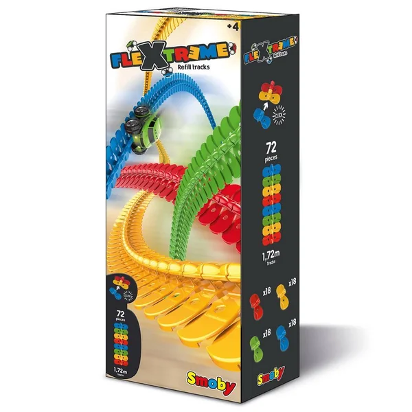 FleXtreme est un tout nouvel univers mettant au défi la créativité de l’enfant. Composé de pistes flexibles et de véhicules, l’enfant peut créer un circuit en assemblant les pièces les unes aux autres. Grâce à sa créativité et à l’environnement qui l’entoure, il peut réaliser le circuit le plus incroyable possible. Les pistes s’emboitent facilement et sont tellement flexibles que l’enfant peut faire passer ses pistes au-dessus d’une chaise, de son lit, ou encore de sa commode. Mais pas seulement ! Looping, à l’envers, sur le côté… Cette recharge de 72 pistes permettra à l’enfant d’agrandir son circuit et de prolonger son imagination à l’infini. 1.72 mètres de pistes supplémentaires.