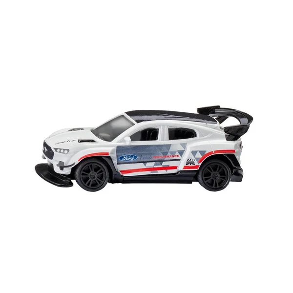 Mesdames, Messieurs, vous voyez ici un chef d’œuvre absolu de l’évolution du sport automobile : la Ford Mustang Mach-E 1400. Il est à peine croyable que cette élégante voiture de sport avec son immense aile arrière et ses 1 500 CV sous le capot soit un véhicule électrique ! 3, 2, 1, GO ! La e-Mustang s’élance sans peine à la vitesse maximale et sème ses concurrents en un rien de temps. Les jantes sport avec pneus caoutchouc ont une adhérence parfaite même dans les virages étroits. La carrosserie en métal de la voiture de course séduit par son super design de course et ses inscriptions sophistiquées : blanc éclatant avec accents de couleurs et logos multicolores – sans parler des jantes noires agressives… un rêve pour tous les fans de la légendaire voiture américaine. D’ailleurs, la reproduction fidèle et précise de l’original du bolide est une pièce unique.