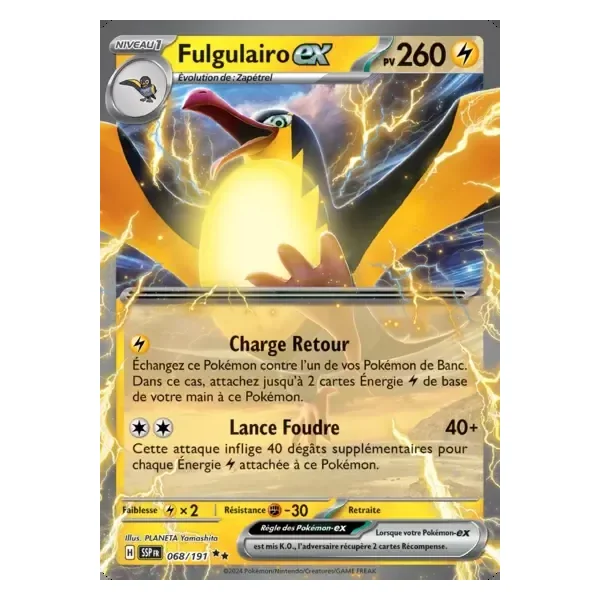 Découvrez Fulgulairo (ssp068), une carte Pokémon de l’extension Étincelles Déferlantes, provenant du bloc Écarlate & Violet. Idéale pour compléter votre collection, cette carte Double Rare plaira autant aux collectionneurs qu’aux joueurs.