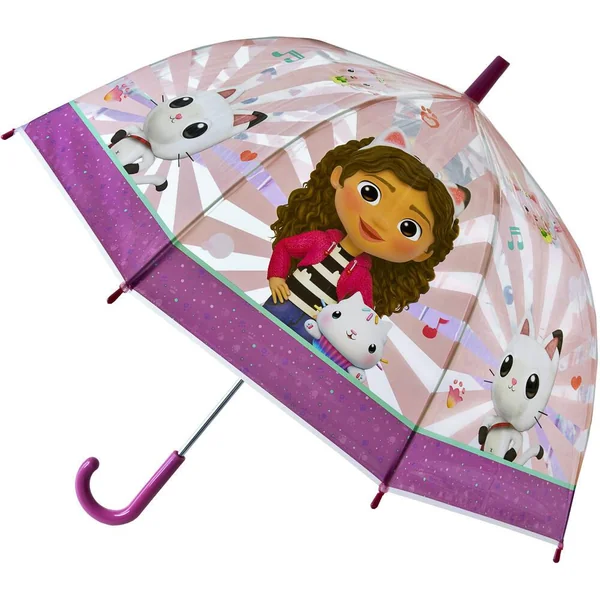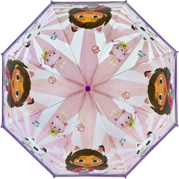 Parapluie imprimé Gabby et la Maison Magique à 8 panneaux. Forme dôme. Panneau de 48 cm. 8 panneaux imprimés. Matières : POE, bâton manuel, cadre en fibre, poignée en plastique. Longueur totale : 66 cm. Diamètre ouvert 69 cm. Dimensions parapluie fermé : 66 x 9 x 3 cm. Ce produit n’est pas un jouet.