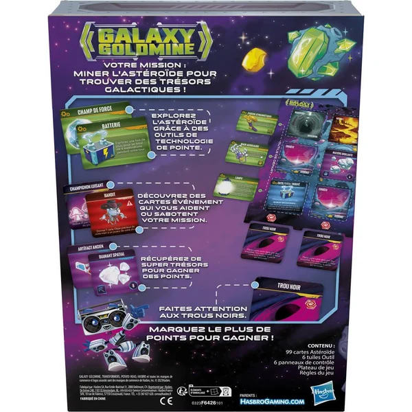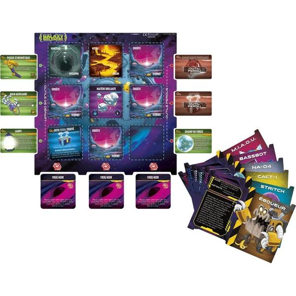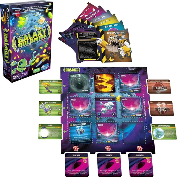 ON EXPLORE L’ASTÉROÏDE AVEC DES OUTILS DE HAUTE TECHNOLOGIE : Incarnant des robots chercheurs de trésor, les joueurs choisissent stratégiquement la bonne carte Outil qui leur permettra de découvrir et d’obtenir un trésor, des artefacts et des outils perdus2 FAÇONS DE GAGNER : Lorsque les joueurs piochent 3 cartes Trou noir, la partie est terminée et le joueur avec le plus de points gagne ! Ce jeu de cartes amusant se termine aussi instantanément si un joueur rassemble les 3 cartes rares Fragment d’holocarteATTENTION AUX PIÈGES, AUX BANDITS ET AUX EXTRATERRESTRES : Cet astéroïde est rempli de surprises ! Il s’y cache des cartes Événement qui incluent des défaillances robotiques et d’autres incidents qui pourraient avantager, ou non, les joueurs –