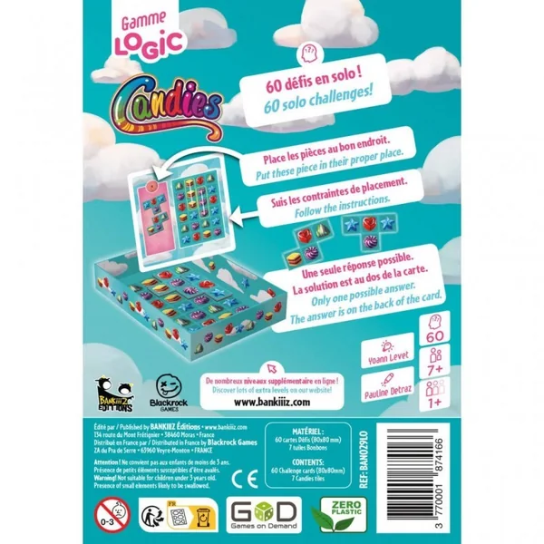 Candies (Gamme Logic de Bankiiiz Éditions) reprend le principe des célèbres jeux vidéo de « match-3 », où il faut réussir à aligner des symboles identiques au sein d’une grille. En plaçant le ou les polyominos indiqués sur la carte Défi, il faut parvenir à modifier l’aire de jeu au fond de la boîte pour récréer les lignes de bonbon imposées. Il faudra donc faire preuve de logique et de projection dans l’espace pour placer chaque tuile au bon endroit.