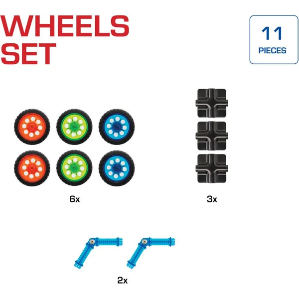 Set d’extension pour créer de super véhicules. Boîte de six roues, deux bas de caisse, et deux arbres de direction.