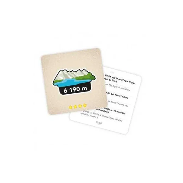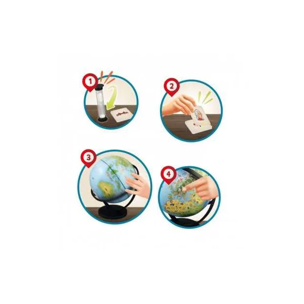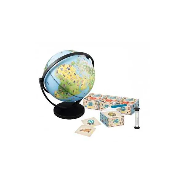 La carte comporte plus de 300 dessins : animaux, monuments, sports, plats culinaires… L’objectif ? Retrouver le dessin sur le globe le plus rapidement possible. L’enfant tire une des 300 cartes, observe le dessin, retourne le sablier et doit retrouver le dessin avant que le sablier ne se soit écoulé. Au dos de chaque carte, l’enfant découvrira une anecdote ou une information.