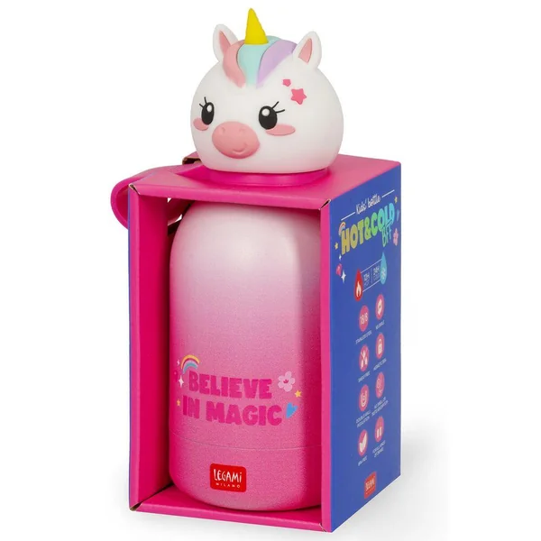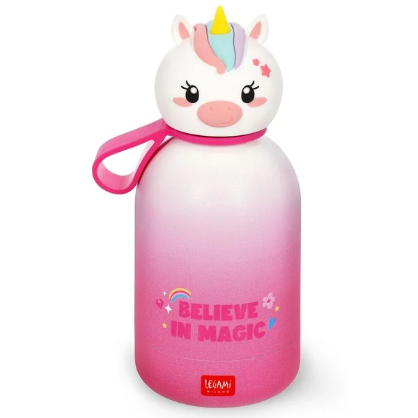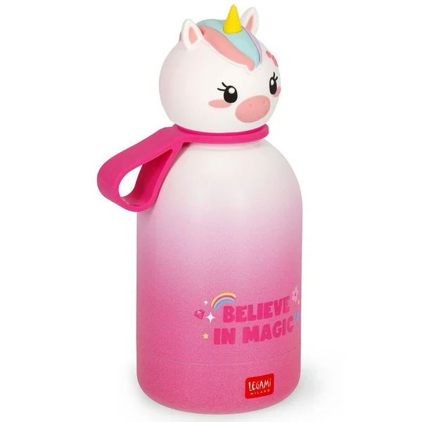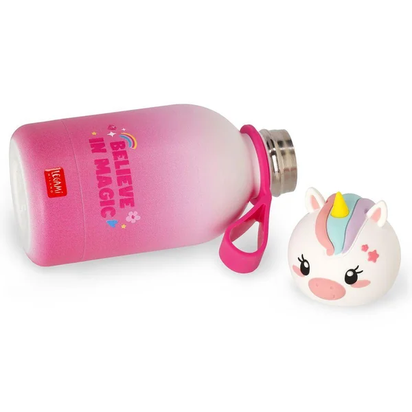 Gourde en acier double paroi inoxydable pour enfant 310ml. Légère et résistante. Fermeture hermétique. Matériau : acier inox 18/8 à double paroi, poignée en silicone amovible.
