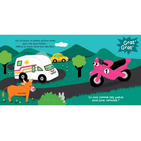 Une petite voiture sort du garage à tout allure ! Mais où va-t-elle ? Sur son chemin elle rencontre de nombreux véhicules et finit par retrouver son ami le bateau pour partir en vacances ! De belles matières à toucher pour impliquer l’enfant dans un histoire rigolote.