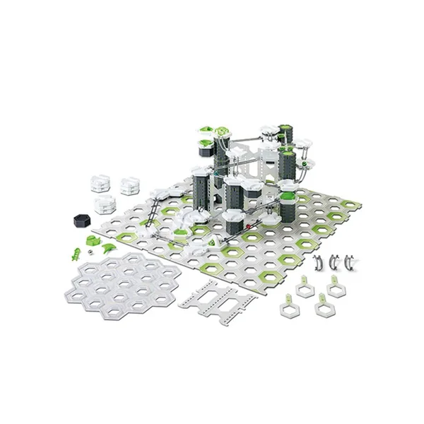 - 153 éléments : 28 blocs virages, 1 bloc 3-en-1, 1 tourbillon, 4 blocs intersections, 1 bloc de départ, 2 aiguillages, 4 blocs avec inserts, 1 chute libre, 1 splash, 2 attrapeurs, 1 arrivée, 1 plateforme transparente, 4 plaques en carton, 9 blocs de construction fins, 20 blocs de construction épais, 6 billes, 2 murs longs, 2 murs moyens, 1 mur court, 3 rails droits longs, 6 rails droits moyens, 9 rails droits courts, 8 rails de Bernoulli courts, 1 échelle d’arrivée, 4 piliers creux, 8 piliers pleins, 16 balcons simples, 4 balcons doubles