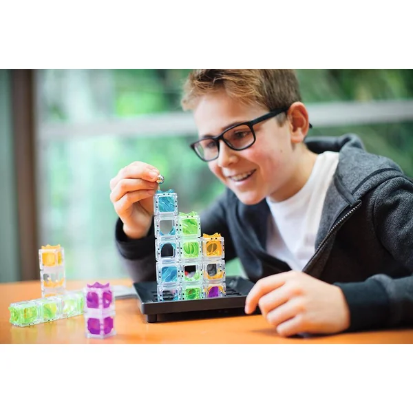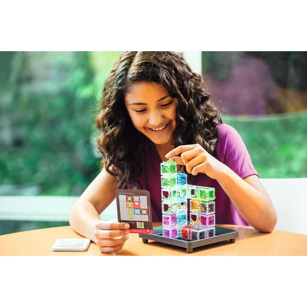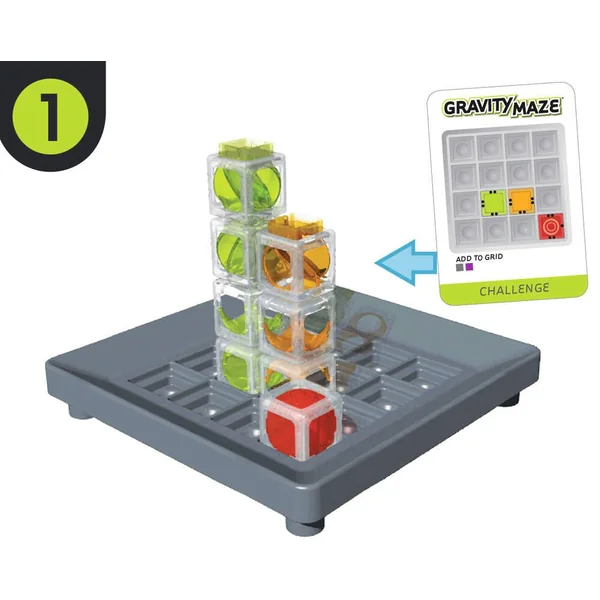 Ce labyrinthe logique répondant aux lois de la gravité mettra à l’épreuve votre perception visuelle et vos capacités de raisonnement. L’objectif est de créer un chemin à travers les tours, qui mèneras votre bille à la Tour cible rouge.1. Sélectionnez une carte-défi et positionnez les tours sur la grille comme indiqué. 2. À présent, déterminez où placer les autres tours sur la grille. 3. Positionnez les tours de sorte que la bille tombe depuis la Position de départ et traverse chaque tour avant d’atterrir dans la Tour cible ? VOUS AVEZ GAGNÉ ! Les tours translucides peuvent être disposées pour créer diverses structures visuellement stimulantes mais, pour chaque défi, vous devrez aussi réfléchir soigneusement et agencer un chemin qui mène votre bille à sa cible. Soixante défis, avec différents niveaux de difficulté, pour de nombreuses heures de construction créative et de remue-méninges !
