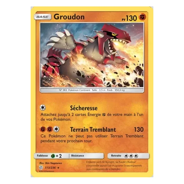 Découvrez Groudon (cec113), une carte Pokémon de l’extension Éclipse Cosmique, provenant du bloc Soleil & Lune. Idéale pour compléter votre collection, cette carte Rare plaira autant aux collectionneurs qu’aux joueurs.