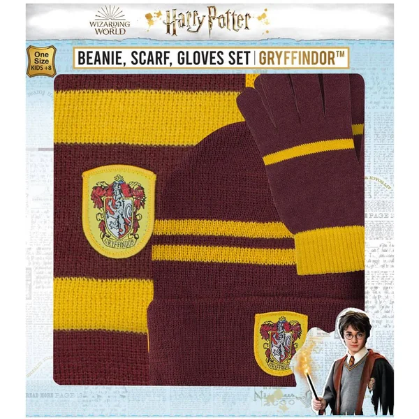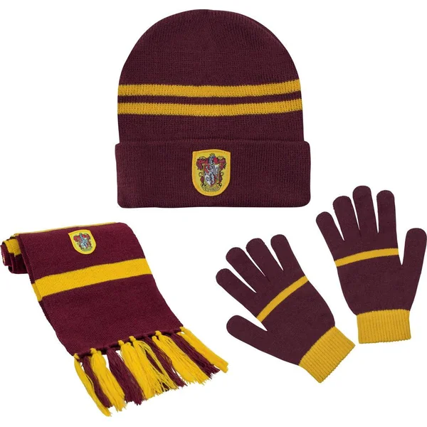 Harry Potter. Coffret cadeau aux couleurs de la maison Gryffondor (en anglais Gryffindor). Pour enfant. Contient : un bonnet, une écharpe et une paire de gants aux couleurs de la maison. 100% Acrylique. Lavable à 30°C.