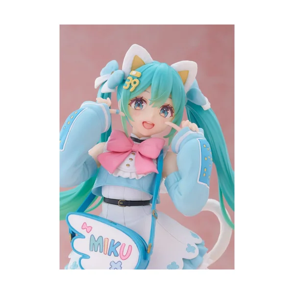 Côté costume, tout est pensé pour le thème : un ensemble bleu clair rehaussé d’un gros nœud rose, des manches bouffantes façon veste courte, et une jupe à volants bordée de petites finitions qui renforcent le côté “fête”. Les accessoires font la différence : le serre-tête oreilles de chat, la petite sacoche marquée MIKU, et ce mini pansement sur le genou qui ajoute une touche de charme inattendue, comme un clin d’œil à une idole toujours en mouvement. Les jambières et les motifs en croix accentuent encore l’identité visuelle, entre style pop et codes “street” réinventés.