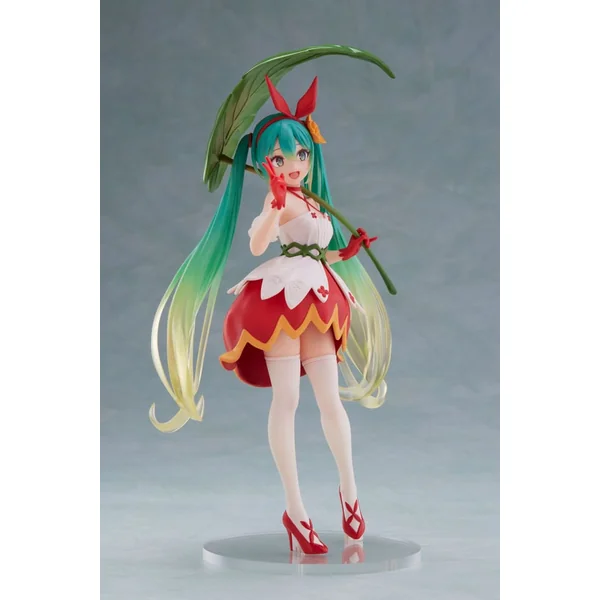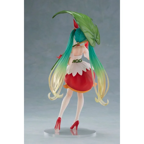Ici, prend des airs de petite héroïne de conte : un sourire lumineux, une grande feuille tenue comme un parapluie, et une tenue rouge et blanche qui évoque une fleur en pleine éclosion. Cette version “Wonderland / Thumbelina” installe une ambiance douce et fantaisiste, comme si Miku venait de traverser un jardin miniature pour s’inviter dans votre vitrine.