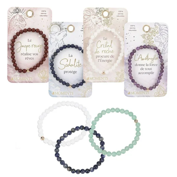 On attribue différents pouvoirs aux pierres précieuses de ces jolis bracelets de perles. Elles apporteraient par exemple l’harmonie, la sérénité, la force, l’ingéniosité ou le courage. Enfilées sur un fil élastique, avec une perle dorée, chaque bracelet a un diamètre intérieur de 55 mm. Les perles ont un diamètre de 6 mm. Chaque bracelet est fixé sur une carte-cadeau rigide, qui donne des informations sur les propriétés énergétiques.