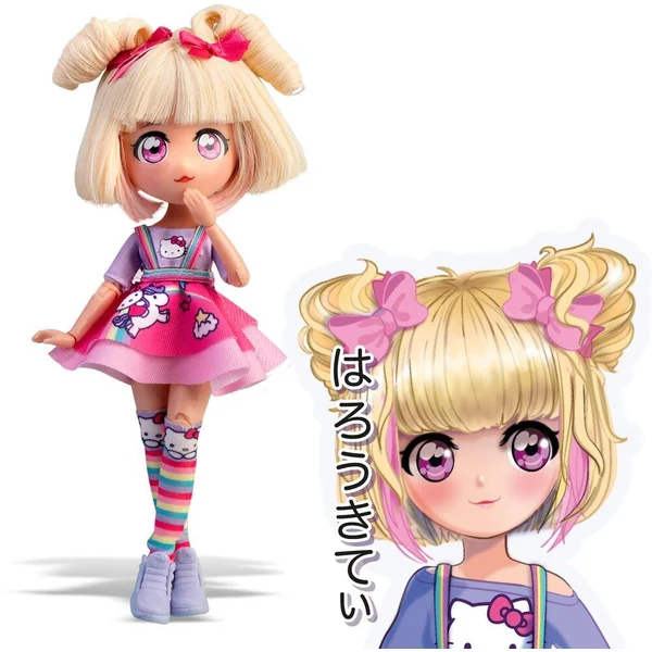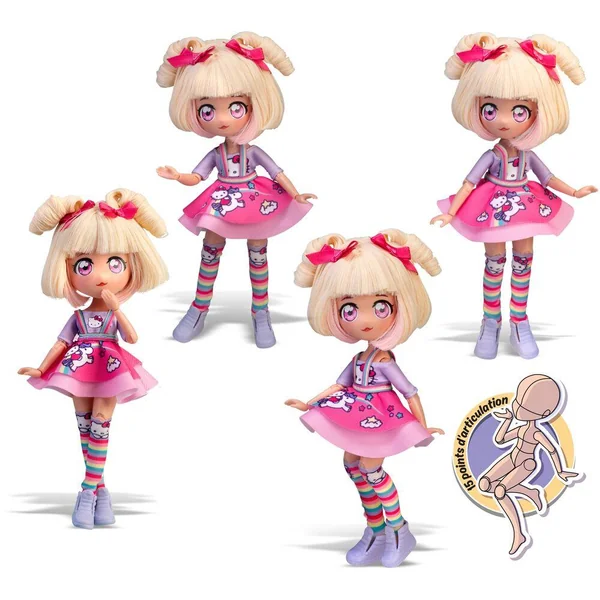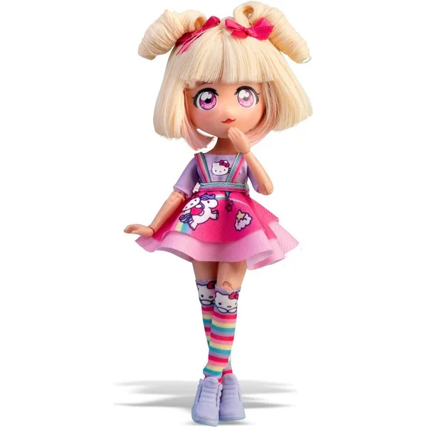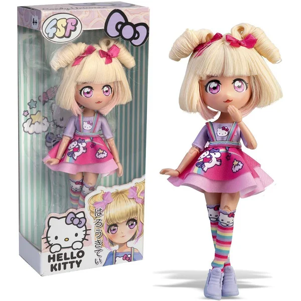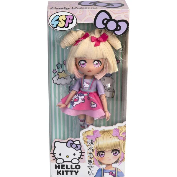 Comprend : 1 poupée super articulée Hello Kitty Super Fans Candy Unicorns avec des cheveux blonds, un T-shirt violet Hello Kitty, une jupe rose avec des bretelles assorties et un imprimé spécial, des baskets violettes, des chaussettes multicolores avec un motif spécial Hello Kitty, des nœuds roses pour les cheveux et bien d’autres détails.