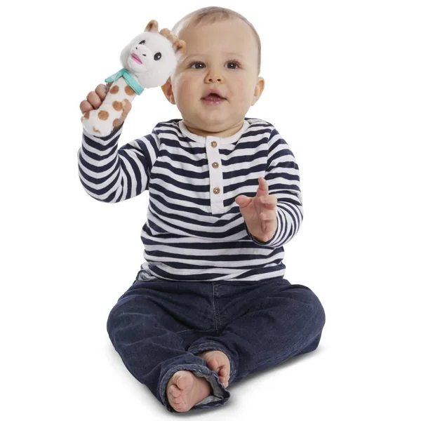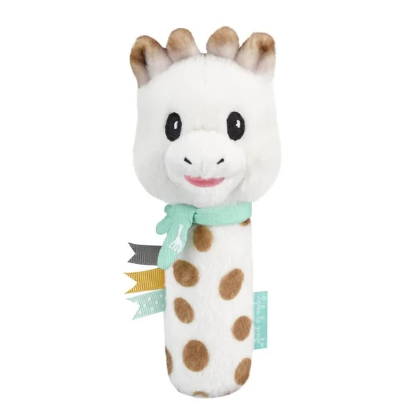 Un hochet tout doux et rigolo ! 2 fonctions: – fonction « pouet » : en serrant le corps du hochet, un doux son de klaxon retentit pour amuser bébé. – fonction grelot : grâce aux billes se trouvant dans la tête de Sophie. Facile à saisir et à serrer par les petites mains. Dim : 16 cm Lavable en surface.