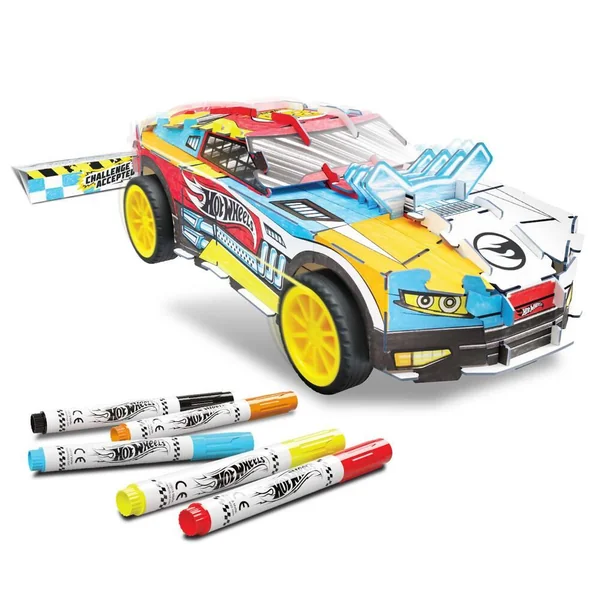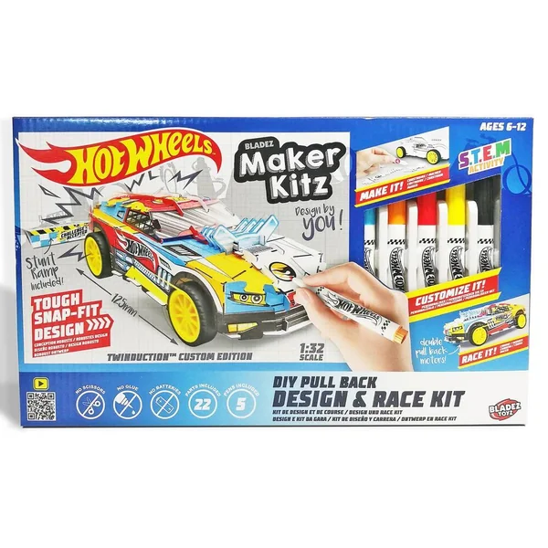 Echelle 1:32. Le kit Maker Kitz te permet de construire ta voiture Hot Wheels™. Il te suffit d’assembler les pièces robustes prédécoupées en les emboîtant. Ajoute de la puissance avec non pas un mais deux moteurs à rétrofriction. Utilise les feutres permanents inclus pour customiser et créer ton propre design ! La voiture assemblée est suffisamment solide pour faire la course et même effectuer des sauts en utilisant la rampe fournie. Facile à assembler : pas besoin de ciseaux, ni de colle. Produit fonctionnant sans piles. 22 pièces au total dont : 3 feuilles avec des pièces prédécoupées, 2 jeux de roues, 5 feutres permanent, 1 rampe en carton, 1 porte-feutres en carton et 1 fiche d’instructions.
