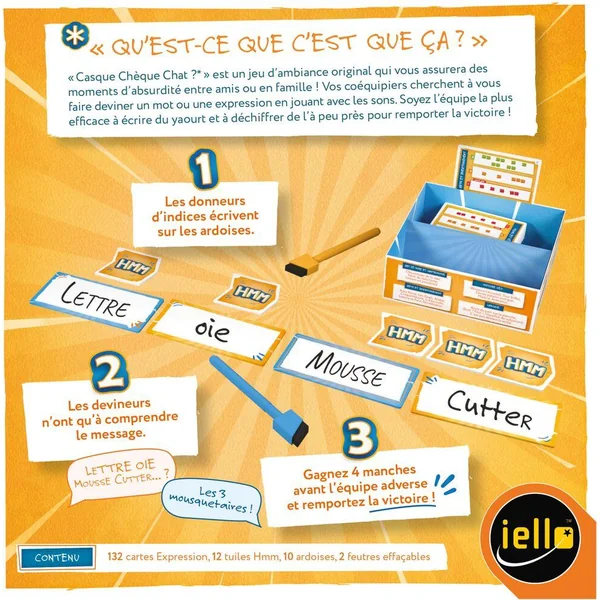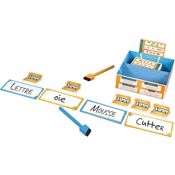 132 cartes Expression, 12 tuiles « Hmm », 10 ardoises, 2 crayons effaçables et 1 règle du jeu