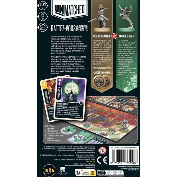 2 figurines Héros, 60 cartes Action, 4 compteurs Santé, 2 cartes Personnage, 2 jetons Acolyte, 1 plateau et 1 livret de règles.