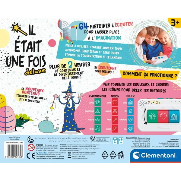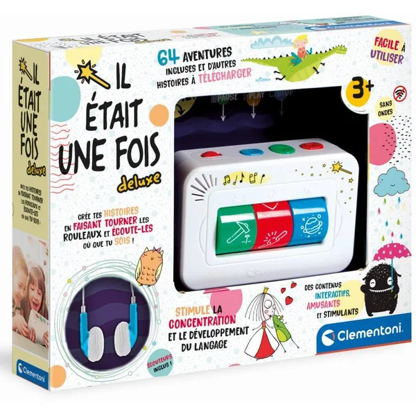 Un conteur interactif pour créer et écouter 64 histoires, dont les éléments peuvent être combinés différemment à chaque fois. L’enfant peut tourner les 3 rouleaux pour décider du personnage, du lieu et du thème. Plus de 2 heures de contenu et de divertissement déjà inclus, et de nouveaux contenus téléchargeables gratuitement sur le site de Clementoni. Un jeu idéal pour stimuler l’imagination, les capacités d’écoute et l’attention des jeunes enfants. Avec une prise audio pour brancher les écouteurs inclus.