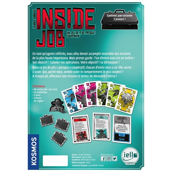 Inside Job est un jeu de plis à très haute tension, dans lequel les joueurs doivent réussir le pli demandé par la carte mission. Chaque carte mission, en effet, indique la manière dont elle doit être résolue et quel est l’atout de la manche en cours.