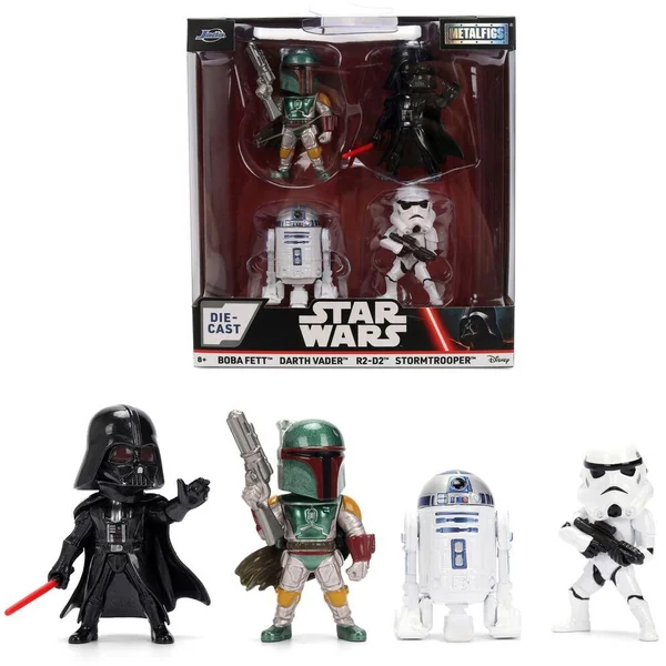 Coffret de 4 figurines en métal de 6cm représentant les personnages de la saga Star Wars : Dark Vador, R2-D2, un Stormtrooper et Boba Fett.