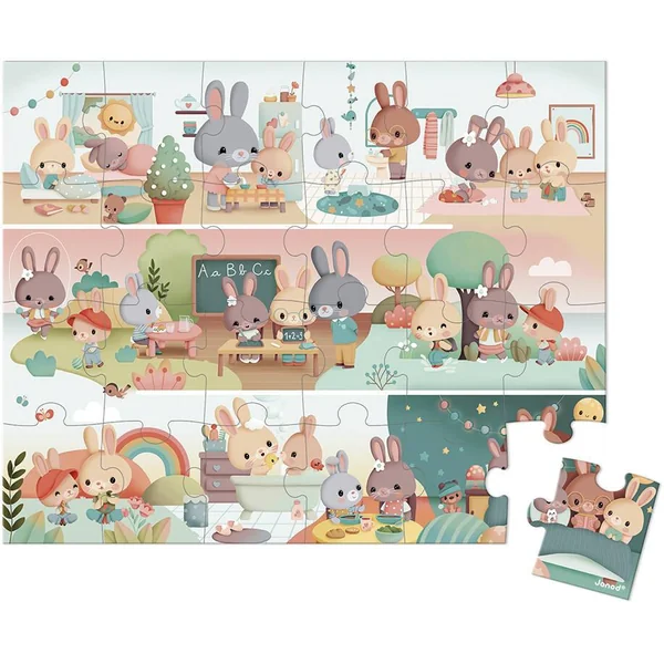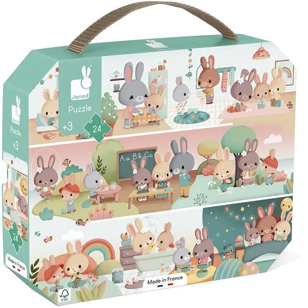 Accompagnez votre enfant dans son quotidien grâce à ce magnifique puzzle représentant une journée du matin au soir. Votre enfant s’identifiera dans le temps grâce à cette famille de lapins : Se lever, déjeuner, se laver, puis partir à l’école … Un puzzle d’éveil en carton de 24 pièces idéal pour aider l’enfant à se développer et se situer dans le temps. Dans sa jolie valisette, ce puzzle sera facile à transporter grâce à sa poignée en tissu. Contient un poster servant de modèle pour les débutants, les plus aguerris pourront ensuite réaliser le puzzle en toute autonomie. Fabriqué en France, produit FSC™ et à base d’encres végétales.