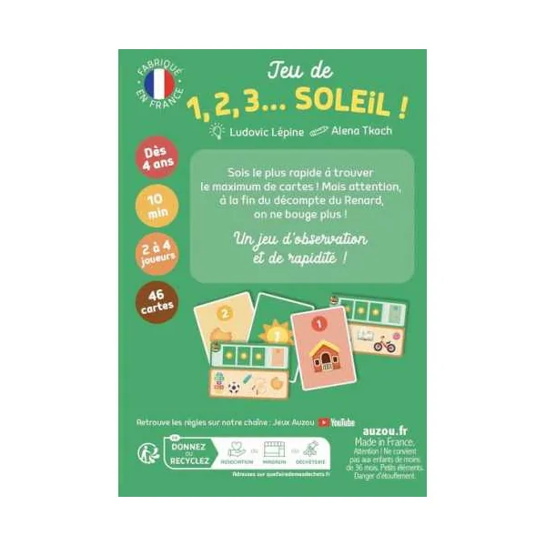 Découvrez le jeu de cartes 1,2,3 soleil! de Auzou, un jeu de rapidité et d’observation à partir de 4 ans. Sois le plus rapide à trouver le maximum de cartes ! Mais attention, à la fin du décompte du Renard, on ne bouge plus!