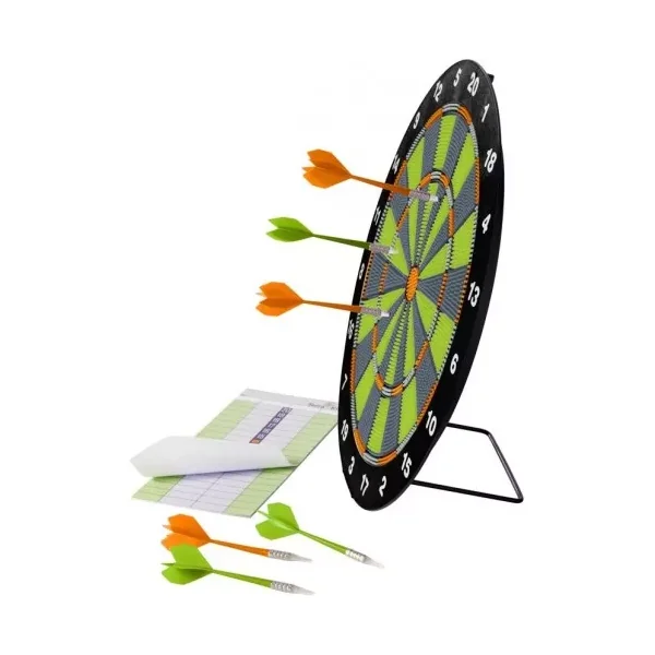 Le jeu contient une cible, 6 fléchettes, 1 carnet à points et un support métallique pour poser la cible sur une table et un trou à bords renforcé pour la fixer au mur.