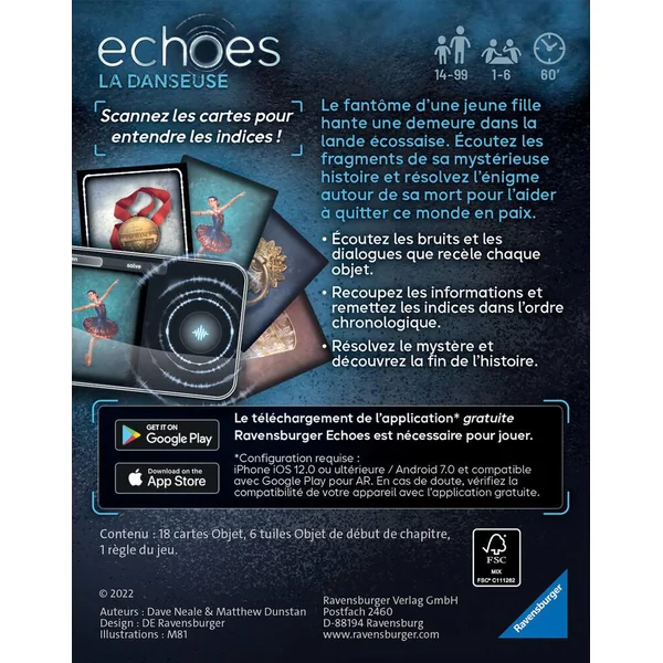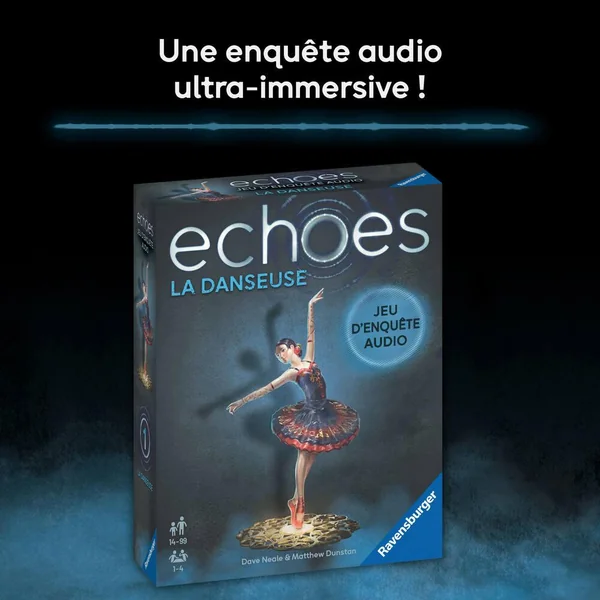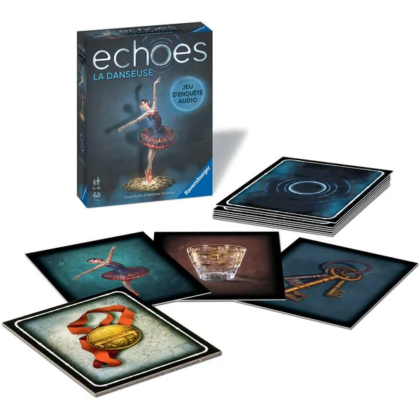 Résolvez le meurtre de la danseuse dans ce jeu d’enquête. Scannez les cartes de ce set grâce à l’appli gratuite Echoes (disponible sur les stores apple et android) et suivez les indices audios. De 1 à 6 joueurs.