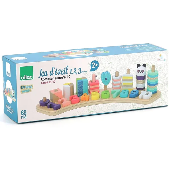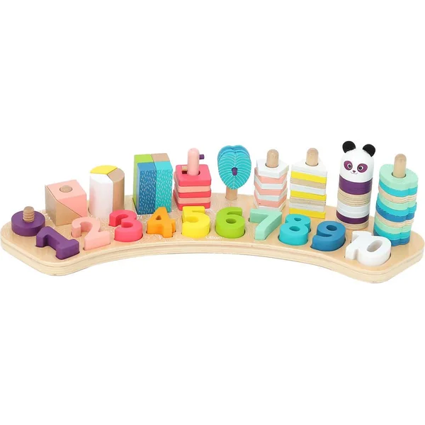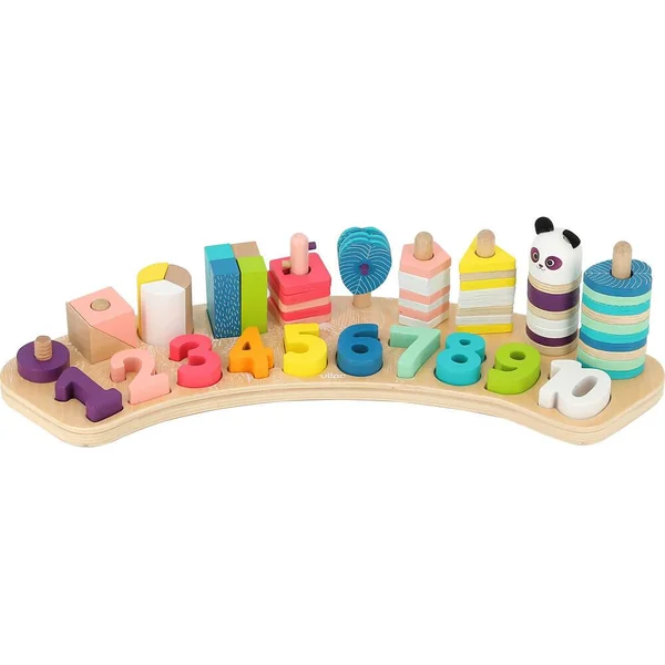 Les chiffres sont de formes et de couleurs différentes et permettent de tester associations et empilages, faisant découvrir aux tout-petits les nombres et les ordres de grandeur. Tous les éléments se placent sur un support en bois, délicatement décoré.