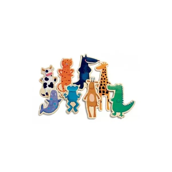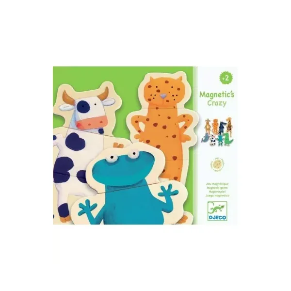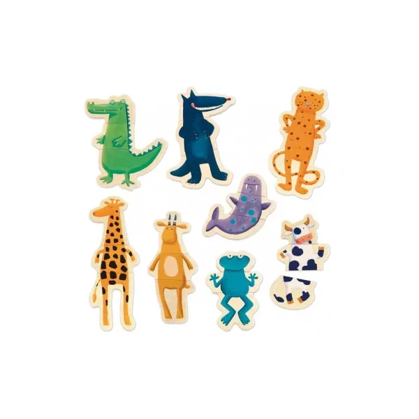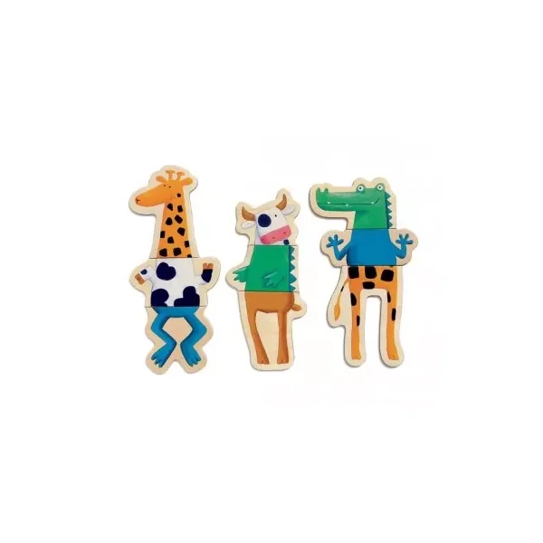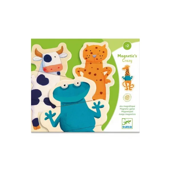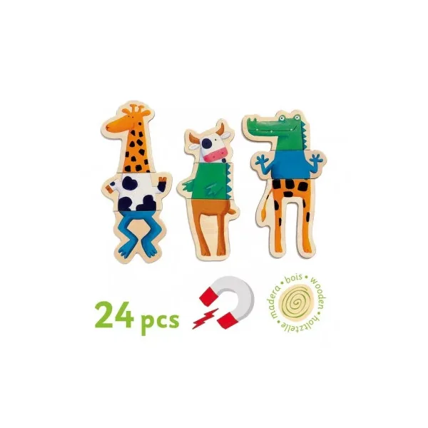 Le coffret contient 24 pièces magnétiques en bois permettant de créer 8 animaux de 3 pièces chacun. Votre enfant s’amusera à associer la tête, le corps et les pattes de chaque animal : une vache, un crocodile, une girafe, une grenouille, un loup…