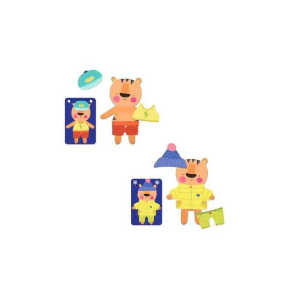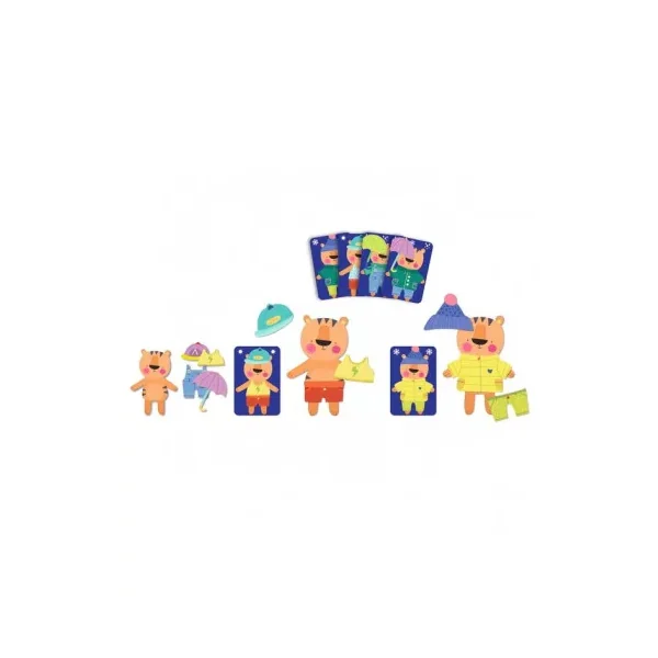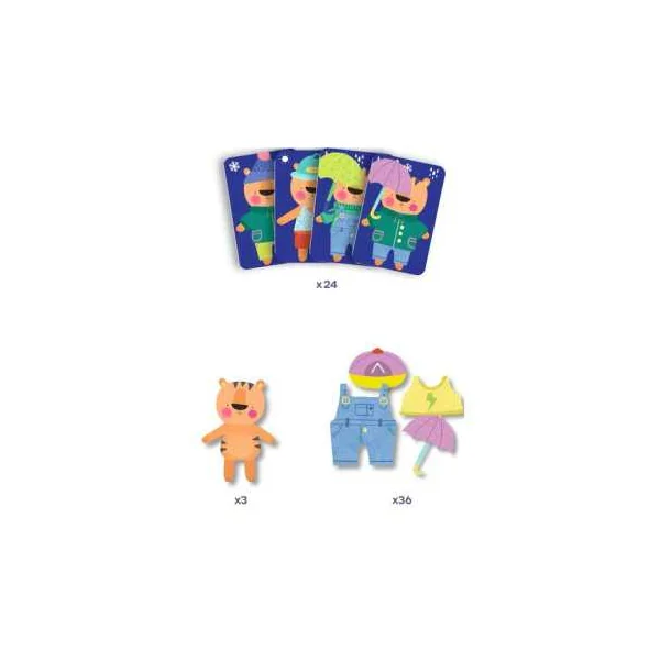 La boite de jeu contient 3 tigres, 2 sets de 18 vêtements en poly pro, 24 cartes et la règle du jeu en 10 langues.