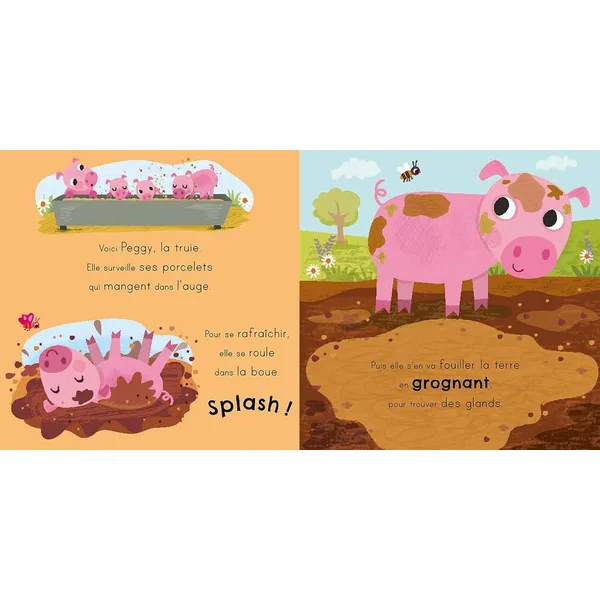 Bienvenue à la ferme ! Les tout-petits vont faire la connaissance de Pâquerette et de ses amis. Au fil des pages, ils vont découvrir la vache, le coq, la brebis, la truie et ses porcelets, et le cheval. Sur chaque page, une matière à toucher incite à caresser l’animal pour entendre son cri. Un livre tendrement illustré et très coloré, pour favoriser l’éveil sensoriel des tout-petits, avec 6 puces sonores et une surprise à la fin !