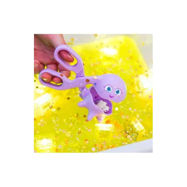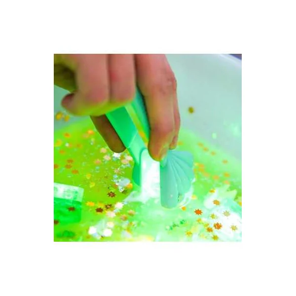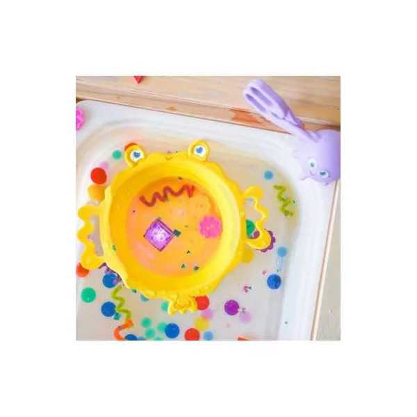 Fabriqués en silicone, ces jouets sont conçus pour ramasser, filtrer et tamiser tout en offrant une expérience tactile unique et sécurisée. Le coffret comprend trois outils : le Puffer Pal est une passoire extensible parfaite pour filtrer et tamiser les petits objets, tandis que la Clamp est une petite pince à coquillages qui aide les enfants à attraper et déplacer des objets facilement. Le Scooper Calamar 3-en-1 est un outil multifonction qui permet de ramasser, égoutter et manipuler avec précision.