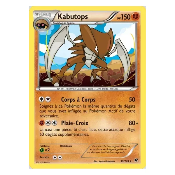 Découvrez Kabutops (fco039), une carte Pokémon de l’extension Impact des Destins, provenant du bloc XY. Idéale pour compléter votre collection, cette carte Rare plaira autant aux collectionneurs qu’aux joueurs.