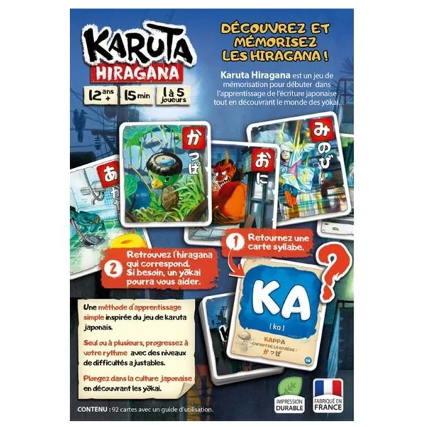 Seul, retournez la première carte syllabe écrite en français et essayez de repérer parmi les cartes étalées sur la table, le yokai ou l’hiragana correspondant. À plusieurs, Les joueurs vont chacun leur tour tenir le rôle du lecteur et lit une carte syllabe. Les autres joueurs cherchent la carte hiragana/yokai correspondante parmi celles étalées sur la table. Le lecteur peut donner des indices. Dès qu’un joueur pense avoir trouvé, il doit toucher le yokai et annoncer : « KARUTA ! ». S’il a juste, il remporte la carte. Le premier à remporter 5 cartes gagne la partie.