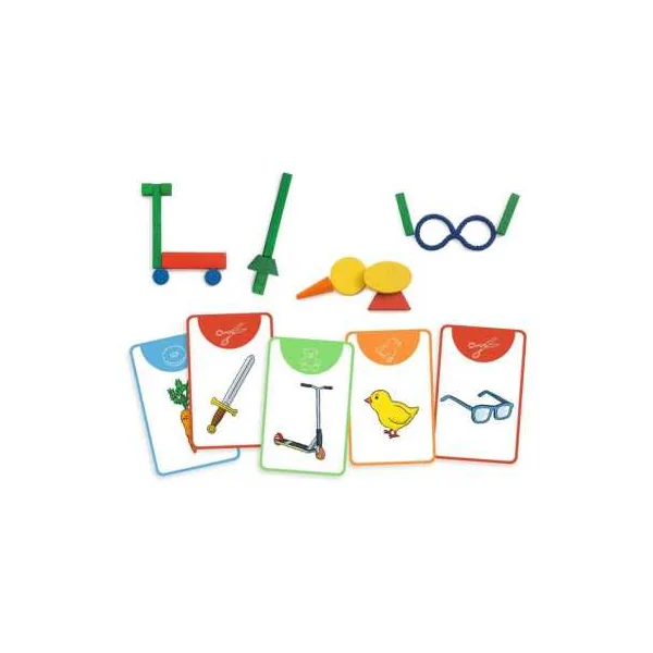 DécouvrezKelBazar de Djeco, un jeu de devinettes créatif pour jouer en famille ou entre amis. Un jeu de société dans lequel les joueurs utilisent des formes en bois et une ficelle pour faire deviner leur carte.
