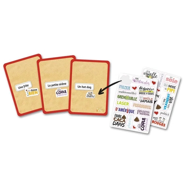 Un joueur pioche une carte Noire et lis-la à voix haute. Ensuite, tous les joueurs choisissent une carte Rouge de leur main qui remplirait bien le |…| de la carte Noire. Pour rendre leur carte Rouge plus intéressante, tous les joueurs choisissent 1autocollant et le collent sur la carte Rouge. Dès que tout le monde est prêt, les créations sont révélées à tour de rôle. Dès que tout le monde est prêt, tous les joueurs pointent du doigt leur carte Rouge préférée. Le joueur ayant obtenu le plus de votes gagne la carte. Créez des combinaisons drôles ou surprenantes pour remplir le |…| de la carte Noire. Avec les autocollants votre jeu deviendra unique et rempli de souvenirs épiques ! Enfin un jeu de communication pour toute la famille.