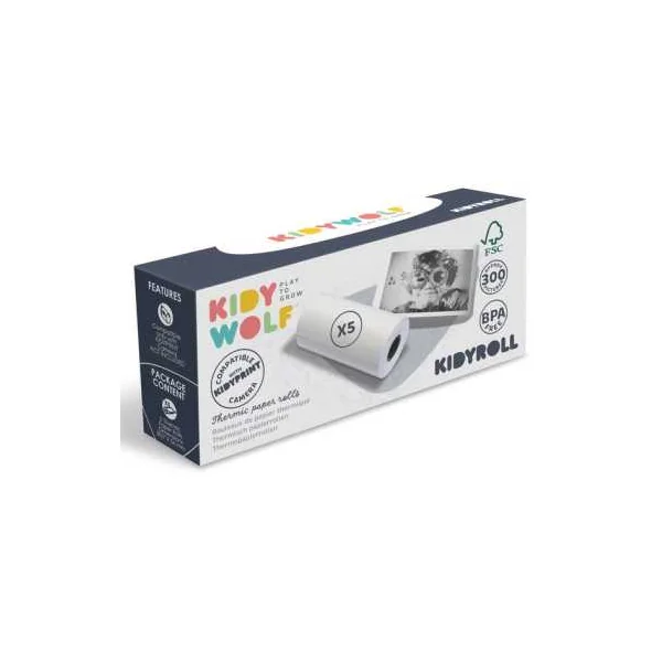 Découvrez les 5 rouleaux de papier pour Kidyprint de Kidywolf, une boite de recharge de 5 rouleaux de papier pour recharger votre appareil photo avec imprimante thermique Kidyprint.