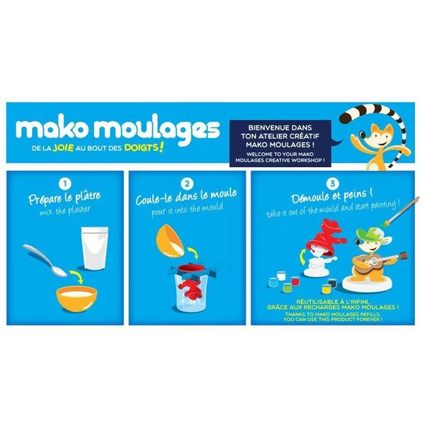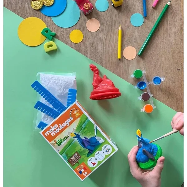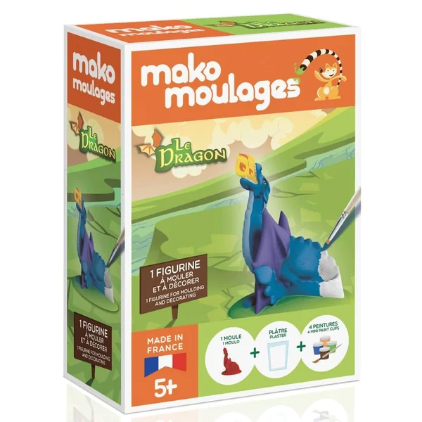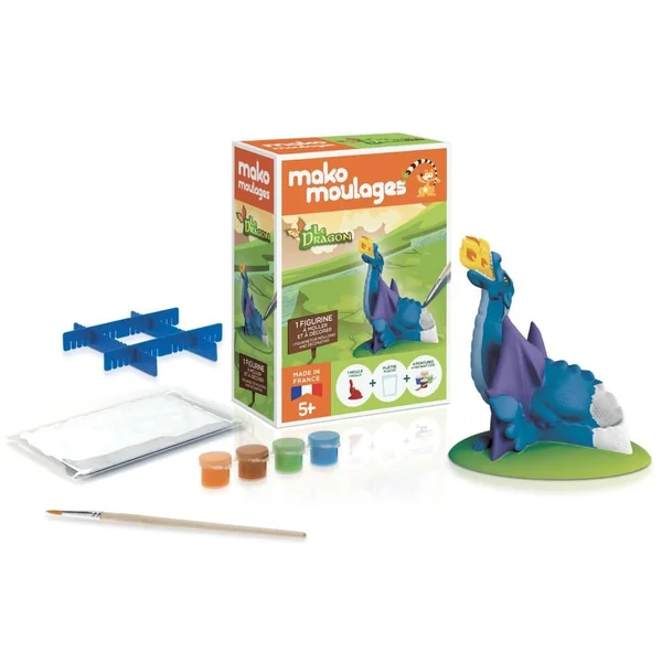 Avec mako moulages, fabrique et personnalise un terrible dragon ! Contient 1 moule en latex, 1 sachet de 150g de plâtre, 4 pots de peinture 2,5 ml. 4 croisillons, 1 pinceau et 1 notice de jeu. Fabriqué en France.
