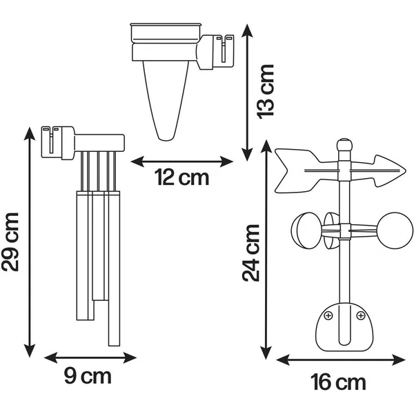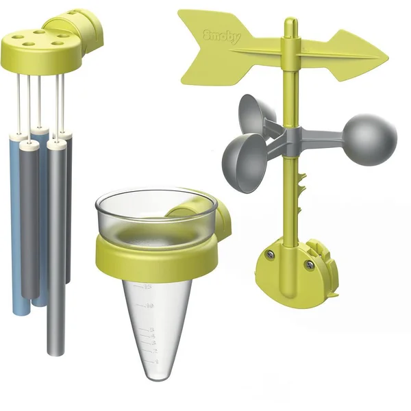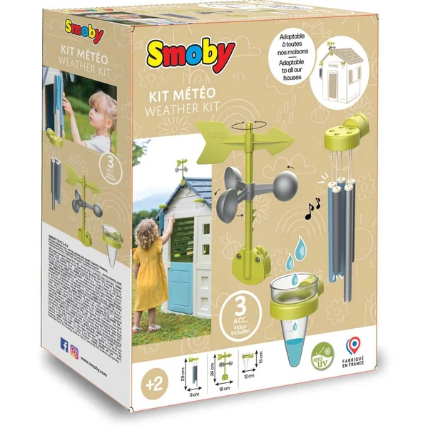 Kit composé d’un carillon, d’une girouette anémomètre ainsi que d’un pluviomètre se fixant sur le toit de nos maisons. Ce kit complet permettra à vos enfant de découvrir, d’observer et de comprendre les phénomènes climatiques de manière ludique. Le carillon permettra non seulement de décorer votre maison mais favorisera également la quiétude grâce à sa douce mélodie activée par le vent. La girouette indiquera le sens du vent à l’aide de la flèche tandis que l’anémomètre indiquera sa vitesse. Le pluivomètre gradué permettra aux enfants de mesurer le niveau de pluie. Les pièces plastiques sont traitées anti-UV pour une bonne résistance et une meilleure tenue des couleurs dans le temps.