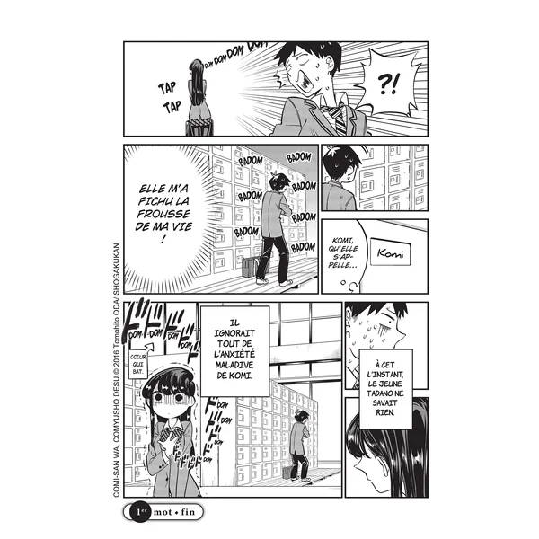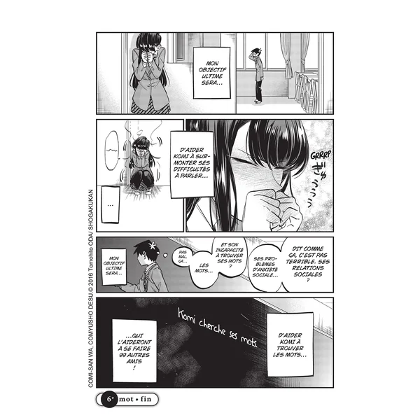 Dès la rentrée, Komi ne passe pas inaperçue : la beauté si singulière de cette fille et son élégance délicate en font une véritable déesse vénérée de tous ses camarades. Mais en réalité, son mutisme n’a rien de raffiné pour elle : en proie à une terrible anxiété sociale, Komi tente en vain de briser le mur du silence et de communiquer avec les autres… Tadano, son voisin de classe on ne peut plus ordinaire, découvrira son secret et décidera de l’aider dans ses incommensurables efforts pour s’ouvrir aux autres afin de réaliser son rêve : avoir cent amis !